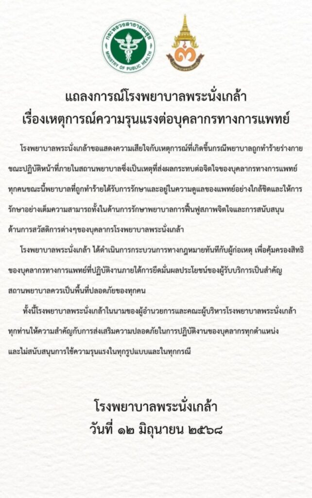 เมื่อวันที่ 12 มิถุนายน ผู้สื่อข่าวรายงานว่า โรงพยาบาลพระนั่งเกล้า ออกแถลงการณ์ ระบุว่า แถลงการณ์โรงพยาบาลพระนั่งเกล้า เรื่องเหตุการณ์ความรุนแรงต่อบุคลากรทางการแพทย์