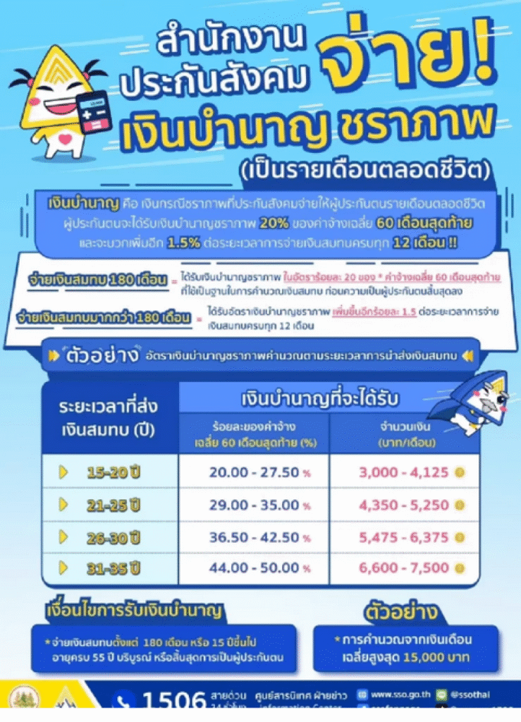 สำนักงานประกันสังคม กระทรวงแรงงาน ประกาศจ่ายเงิน บำนาญชราภาพ ซึ่งเป็นรายได้ประจำรายเดือนตลอดชีวิตสำหรับผู้ประกันตนที่ส่งเงินสมทบครบตามเงื่อนไขที่กำหนด เพื่อรองรับการเข้าสู่วัยเกษียณอย่างมั่นคง โดยการคำนวณบำนาญจะพิจารณาจาก ค่าเฉลี่ยของค่าจ้าง 60 เดือนสุดท้ายก่อนออกจากระบบประกันสังคม